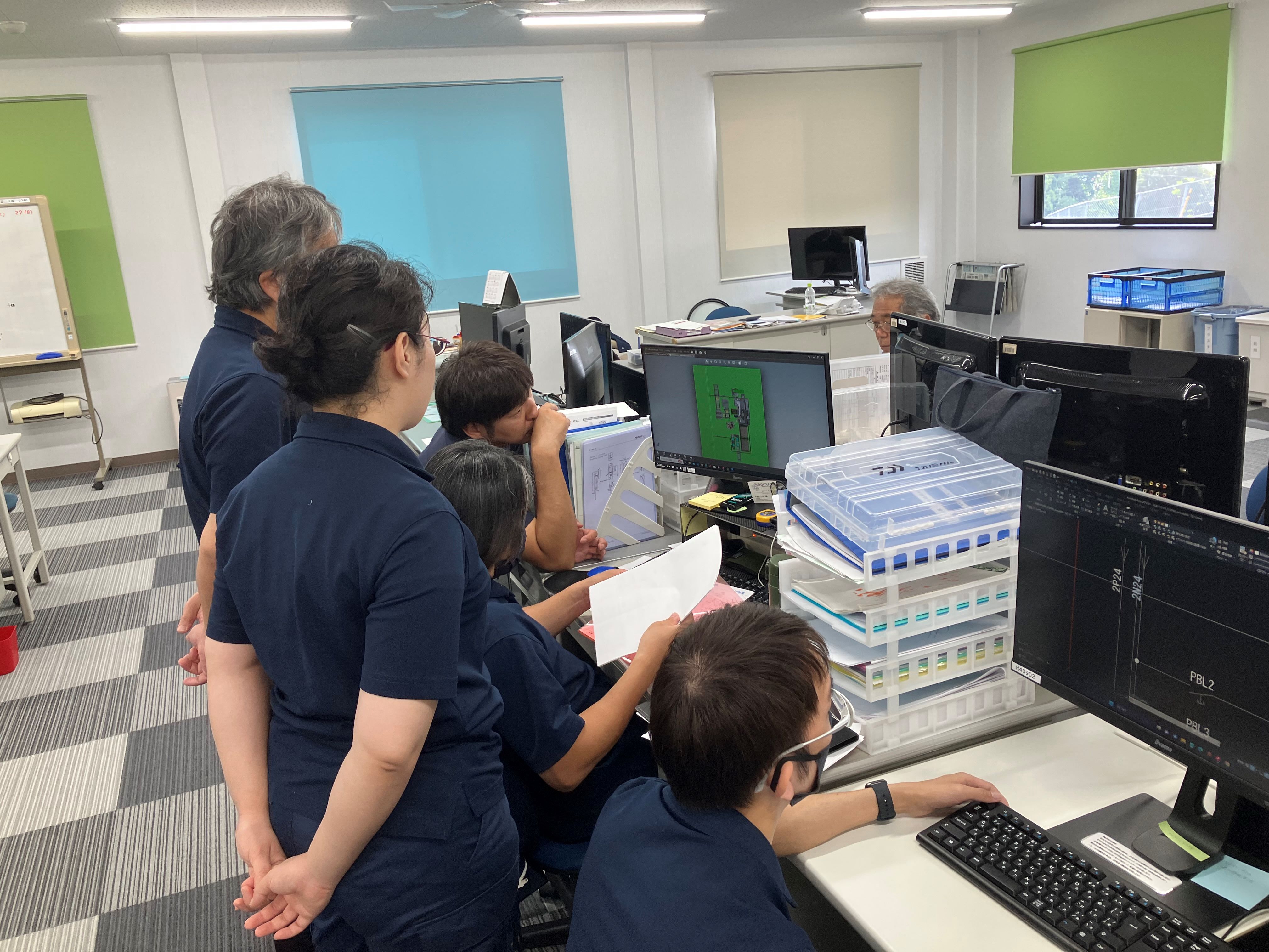 - 仕事中は集中して静かです。問題に直面した時は、みんなで問題解決に向けてディスカッションしています。